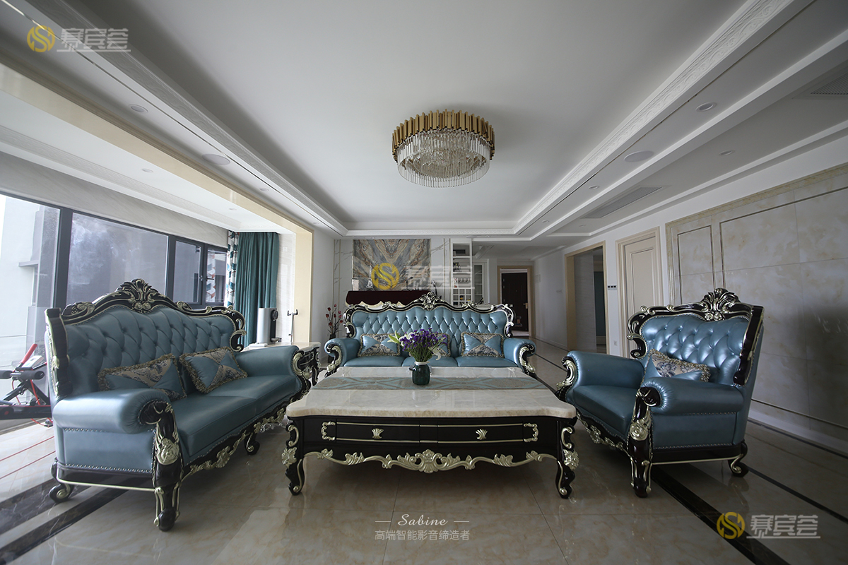 大中欧式客厅风格,采光非常好,客厅简洁高雅,按照如今家庭影院主流趋势,业主本人也是喜欢简洁为主,所以更倾向于定制安装类型的影音设备,可以完全融入居家装修风格,又能同时满足客厅影院音效。