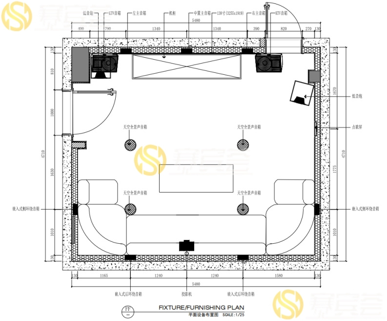 对于做影音室的初衷,也充分提现了业主顾家的好男人一面,业主一家6口,父母妻子一儿一女,居住于此,家里的小朋友喜欢看电影,自己会经常和好朋友聚会看球赛,而妻子喜欢看演唱会,唱歌,所以希望建造一间多功能娱乐使用的影音室,又考虑父母长辈对于新时代产品的使用顾虑,要求影音室智能操控,便捷使用。