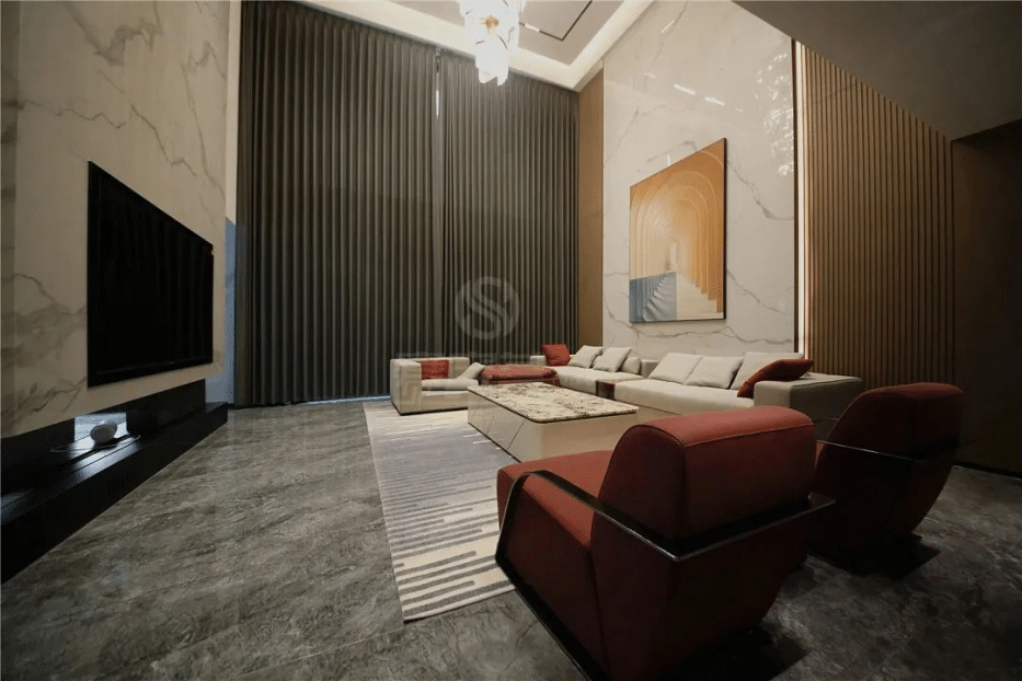 本案例,为业主提供全面性的娱乐设计。在这个别墅的负一层,有个独立的隐藏空间,赛宾介入之前,装修基本完工,面积约40平方左右,长方形的建筑结构,这里原本是业主想打造成KTV室,业主在构建全宅智能、安防的同时,寻求赛宾,将原本单一的K歌功能室,加入电影院的元素,变成综合娱乐的、即能看电影又能唱歌的多功能影音室。