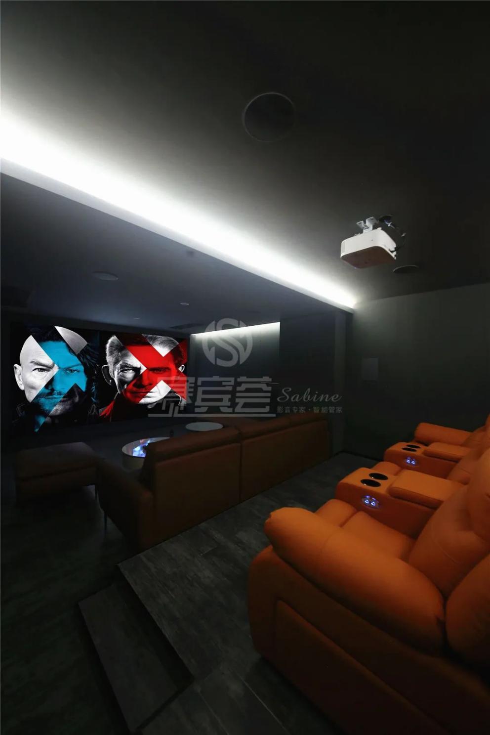 从案例中可以看出,影音室以神秘灰色为主,再以浅橘色点缀其中,这样的色调布局让感官非常舒适。就算设备嵌入墙体软包,也不破坏设计风格,还让设备发出很好的音色效果,真正实现了“颜值”与“才华”双兼备。